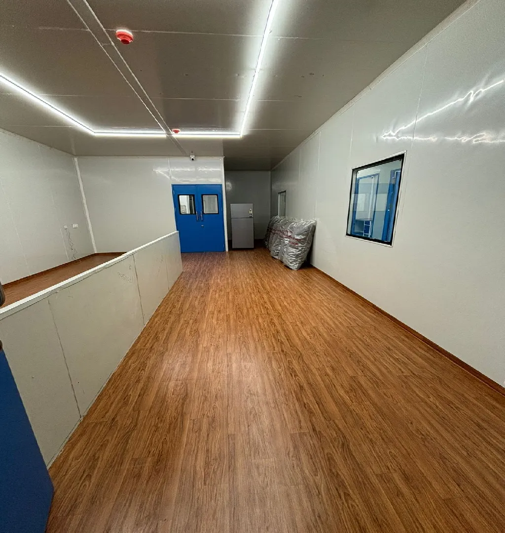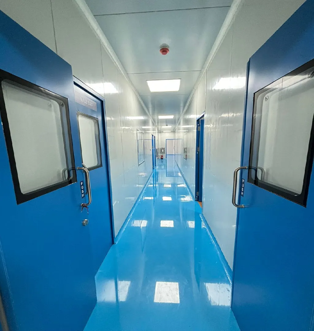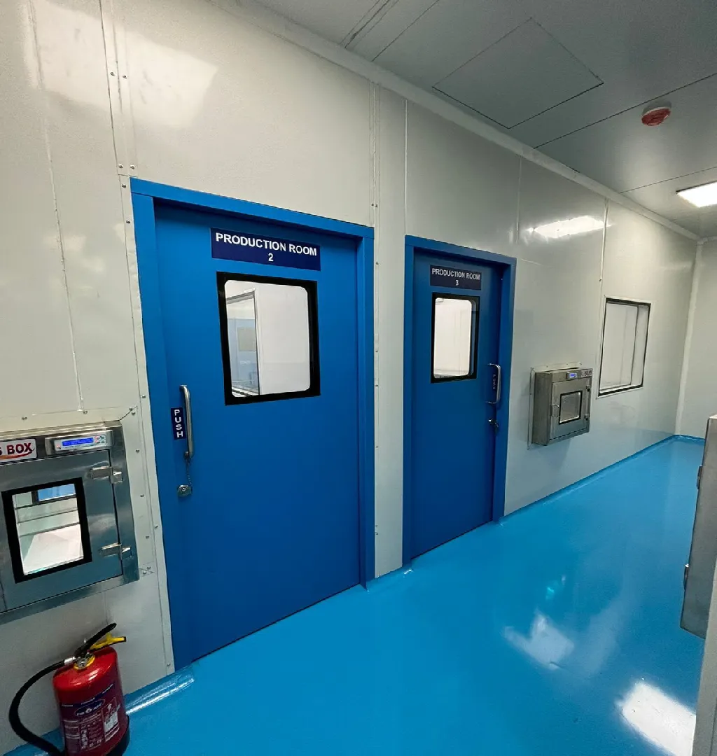 The setup includes a modern ISO Class 8 clean room, multiple production rooms, a QA/QC section, storage, an epoxy-finished production corridor, and well-equipped admin areas.