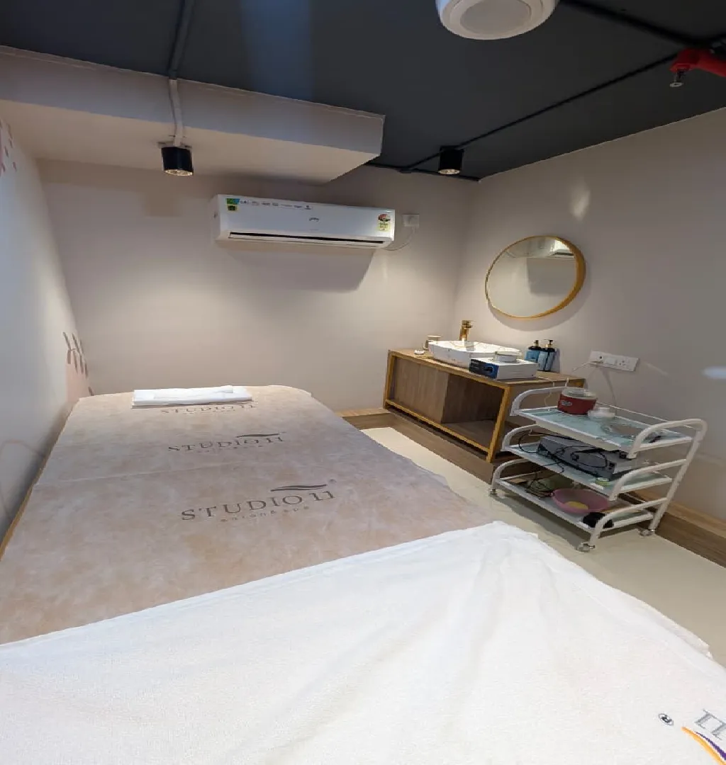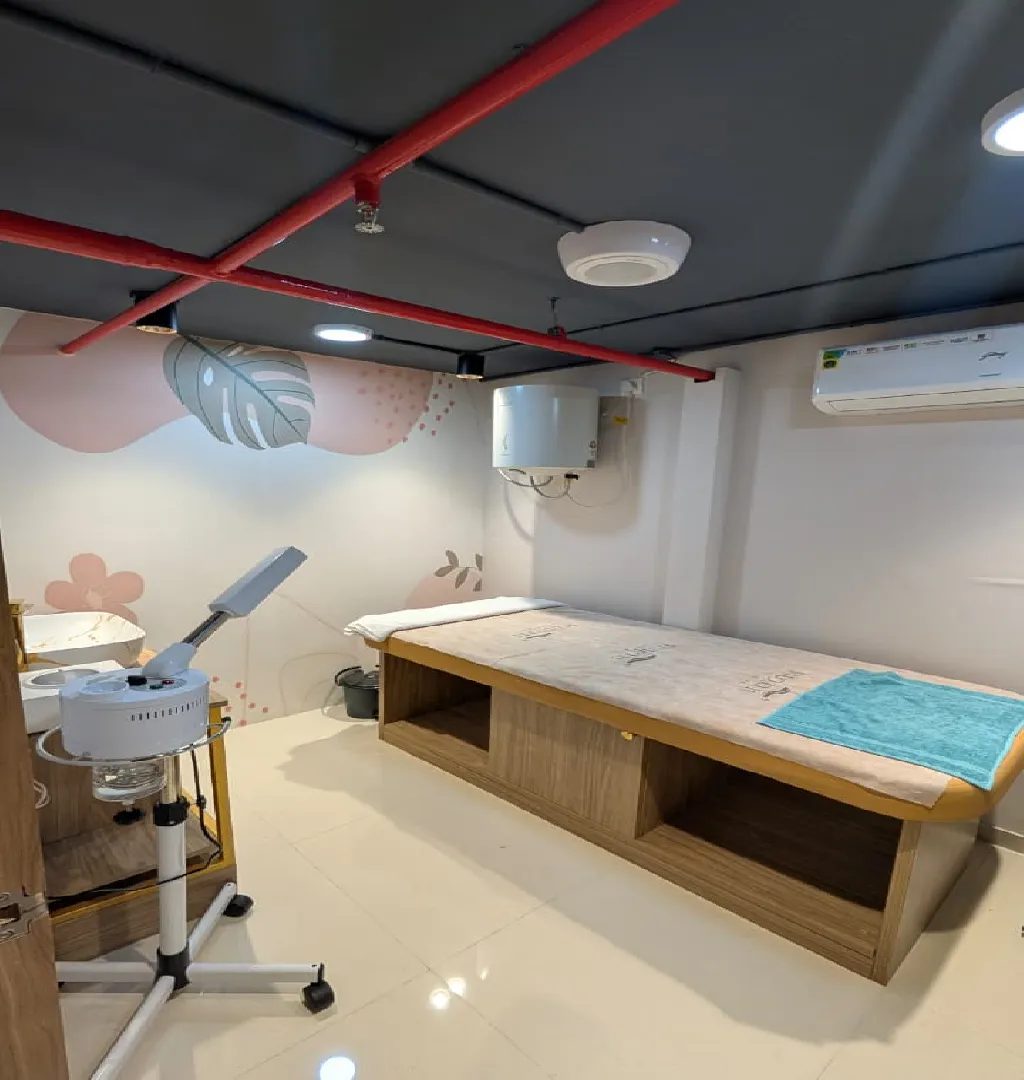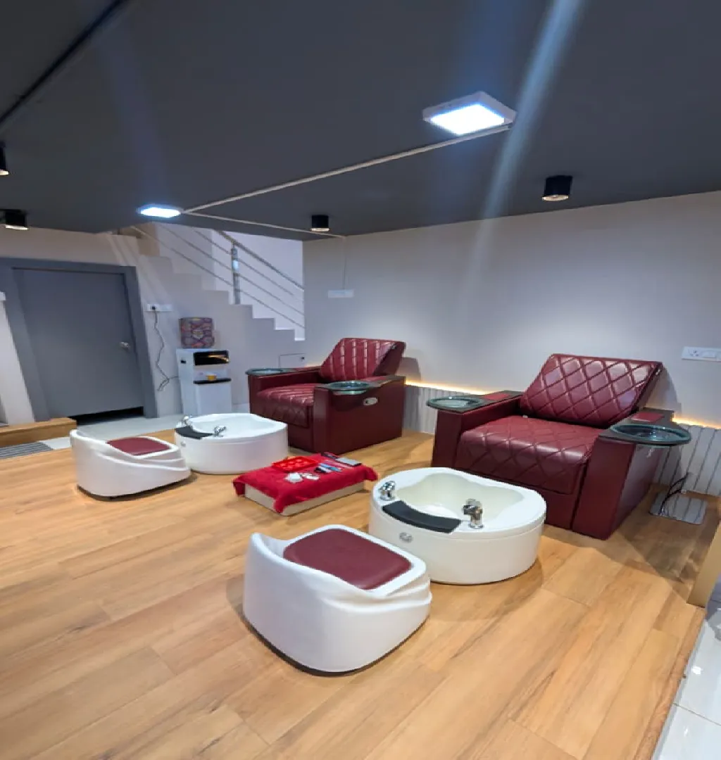 Spread across the ground and first floors, the salon is fully equipped with 10 chairs, which can be expanded to 15 to support future growth. The setup includes five seating stations, two pedicure stations, two hair wash units, a dedicated bridal room, and two service rooms for waxing and other treatments. The ground floor features a nail art section, currently offering nail paint services.