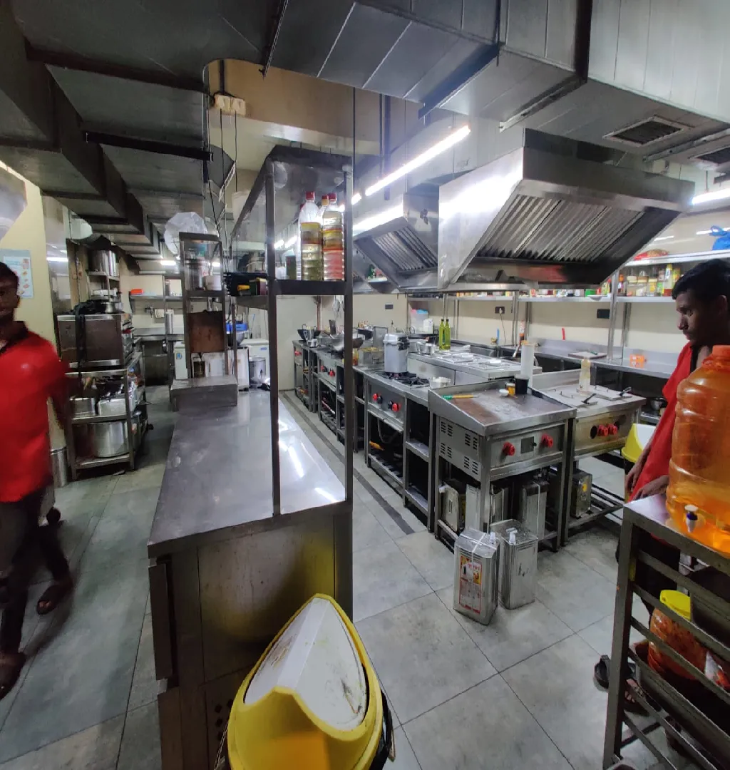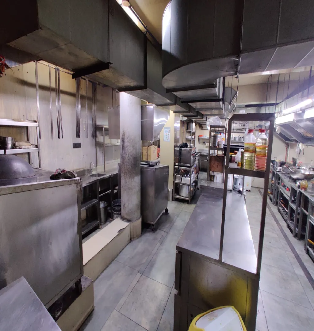 Fully equipped kitchen with tandoor ovens, exhaust systems, and preparation areas
